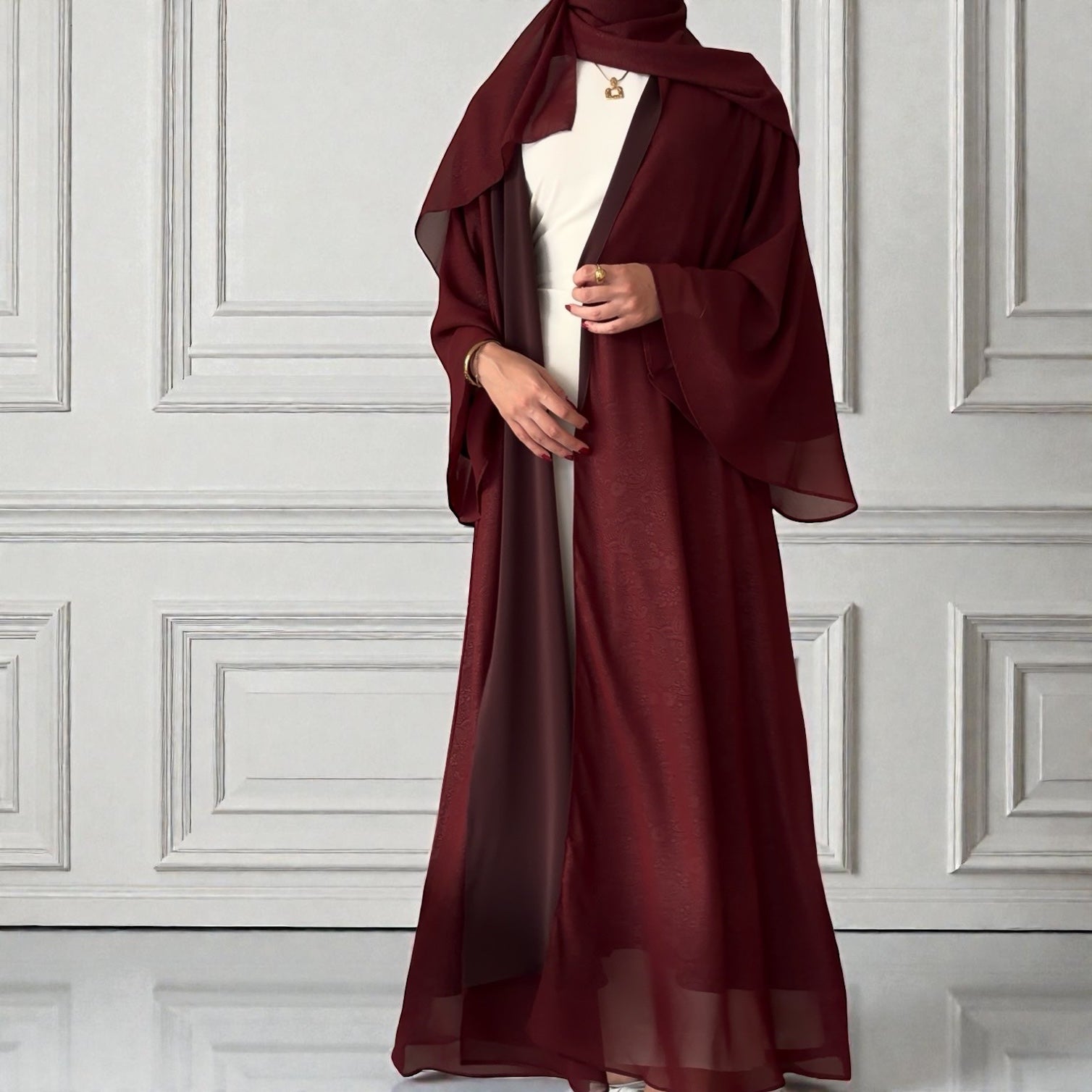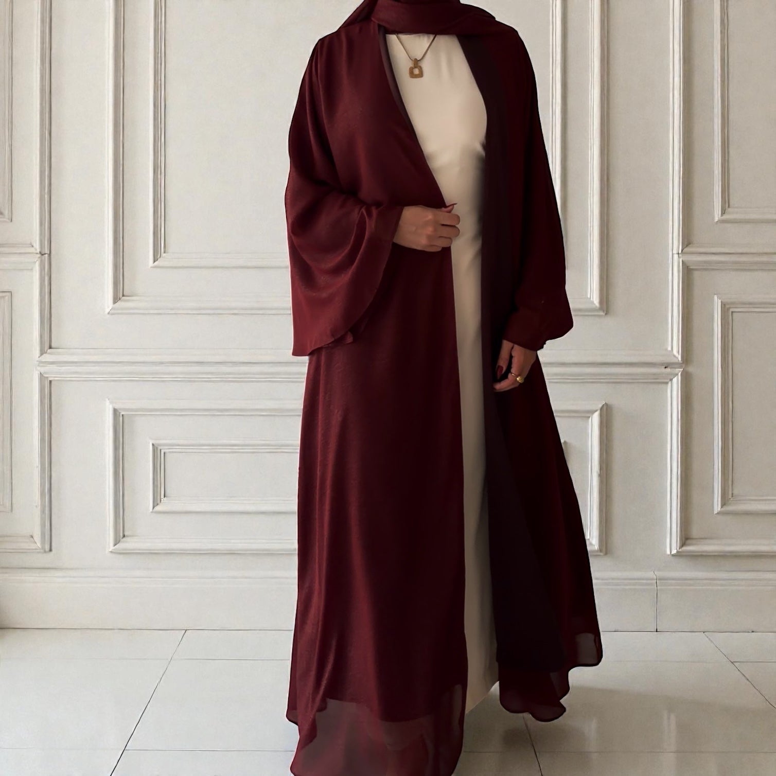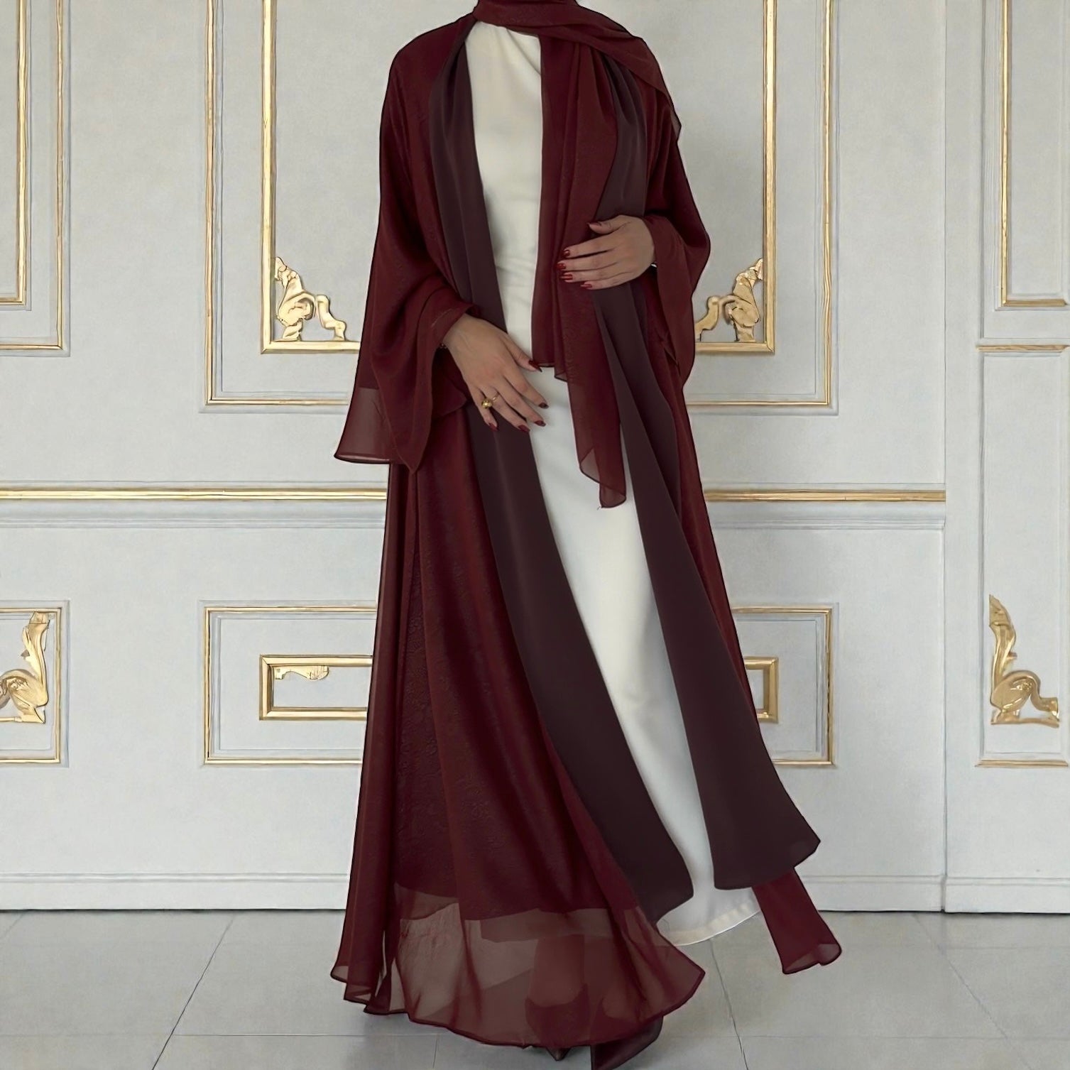 متوفرة باللون الخَمري (لأحمر العقيق): عباية الطبقة الخارجية "احمر عقيقي" والطبقة الداخليه بلون اغمق "احمر الماهوجني", مع فستان أوف وايت لمظهر مخملي وأنيق