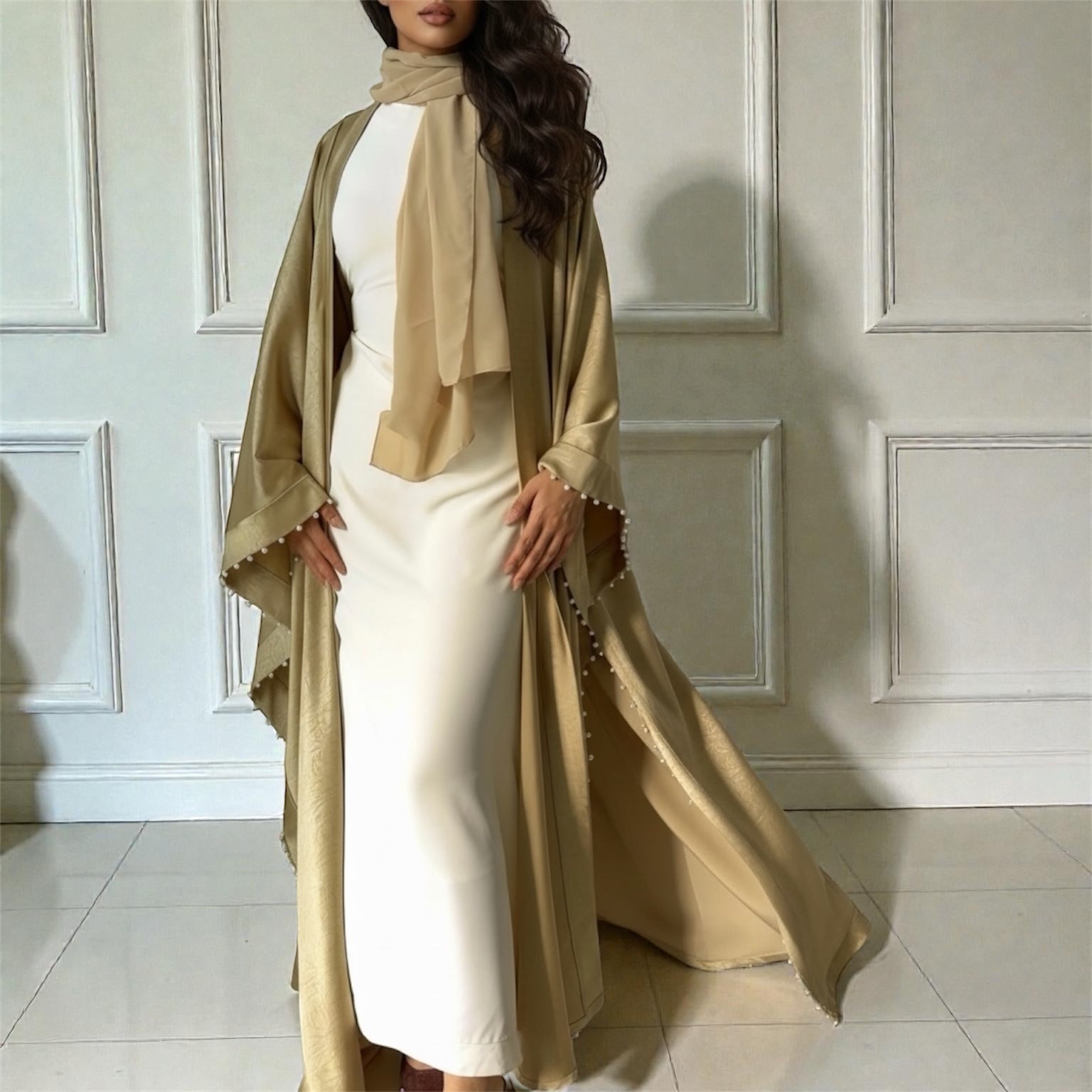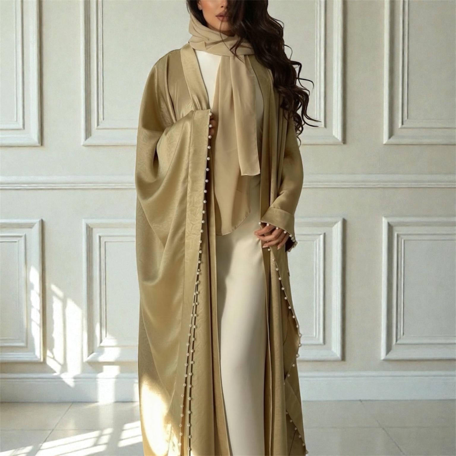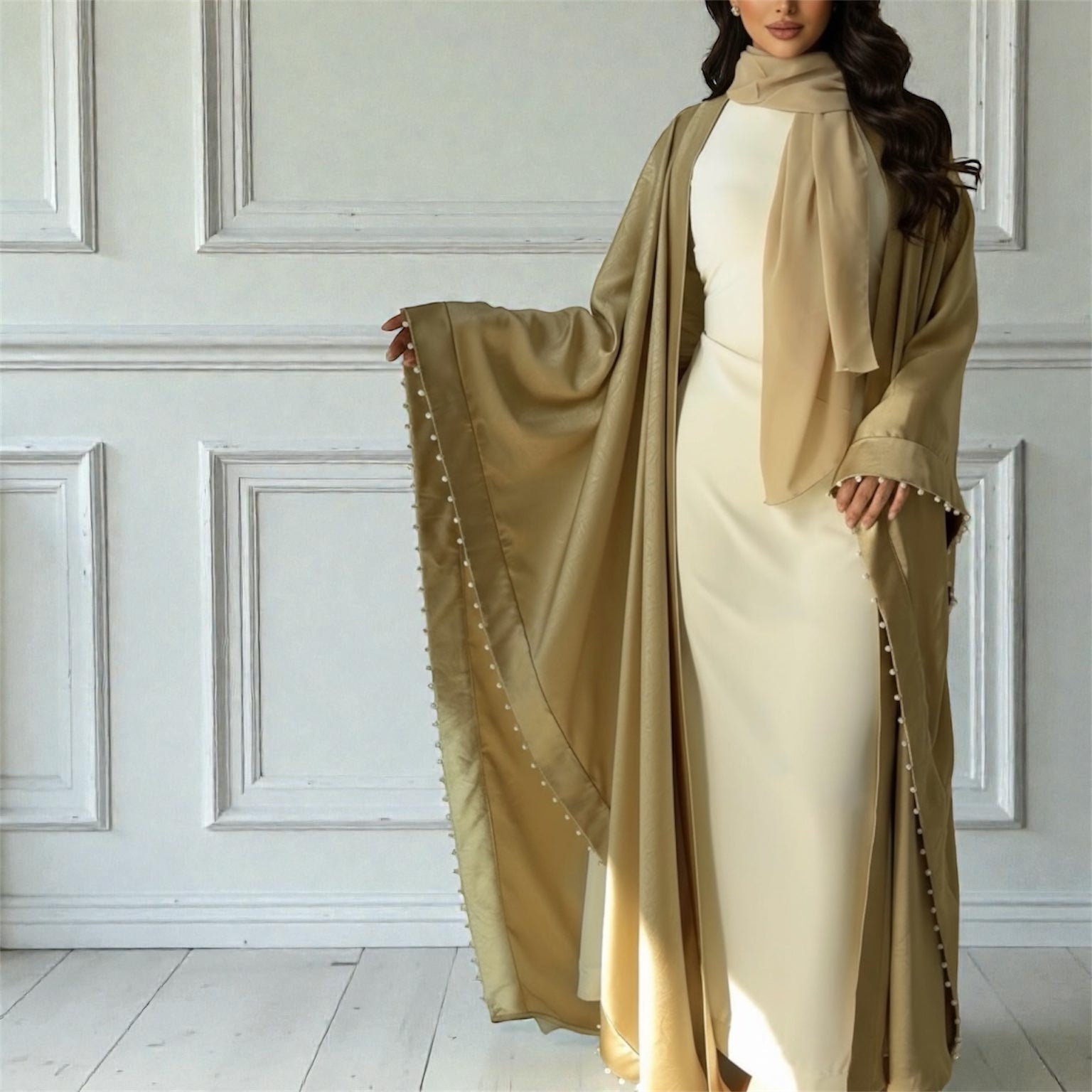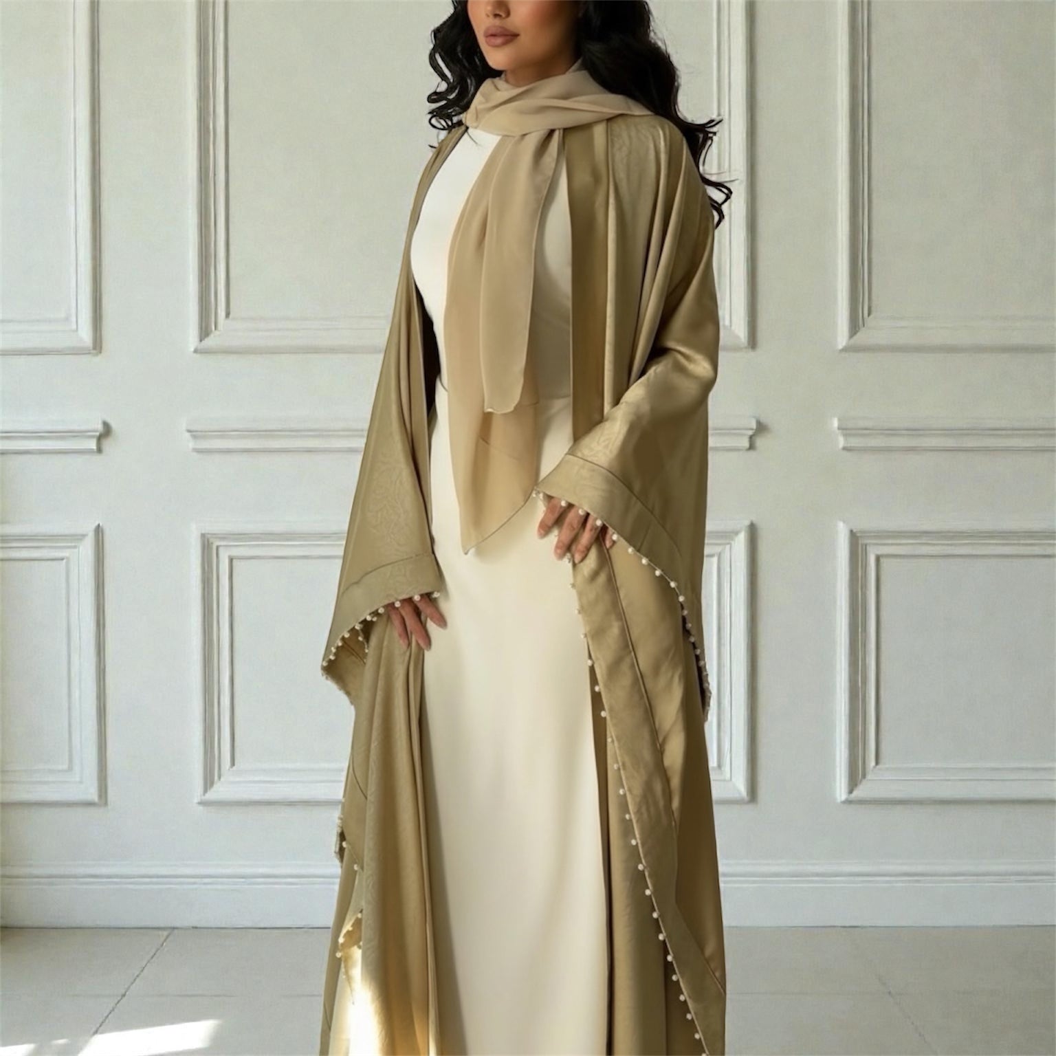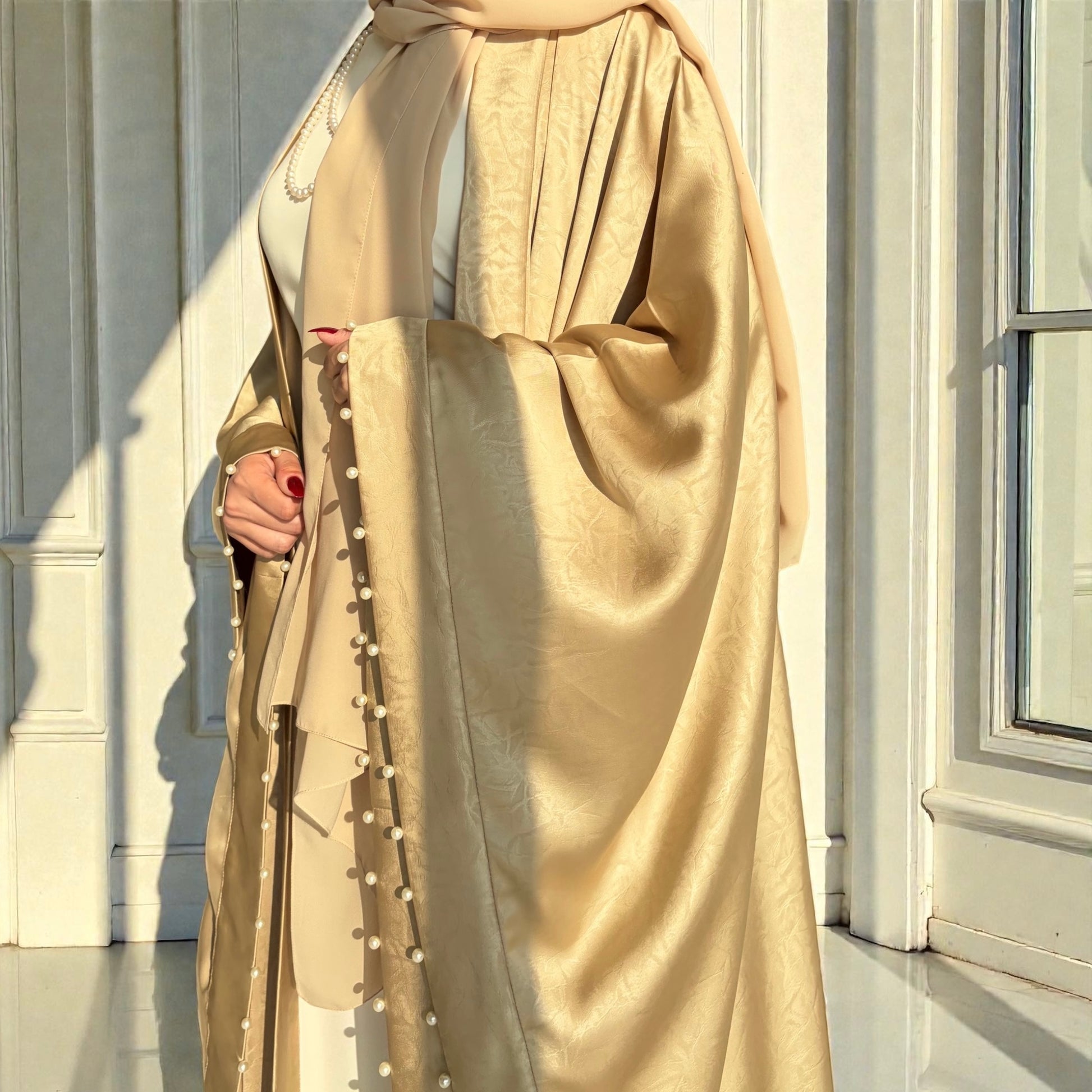 • العباية: قماش ستان ناعم منسدل بلمعة خفيفة تُعطي فخامة، ستايل بدون أكمام مزين بحبات اللؤلؤ على طول اليد.