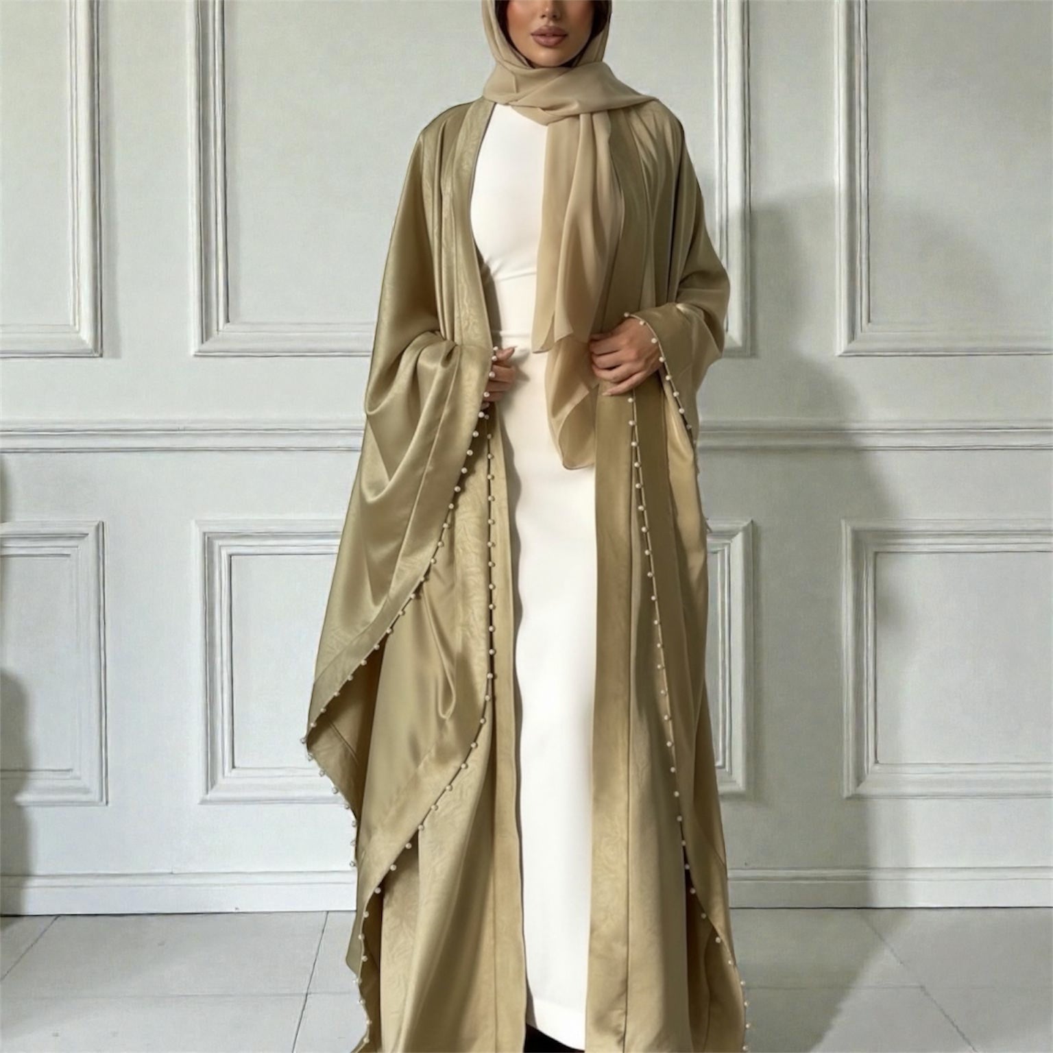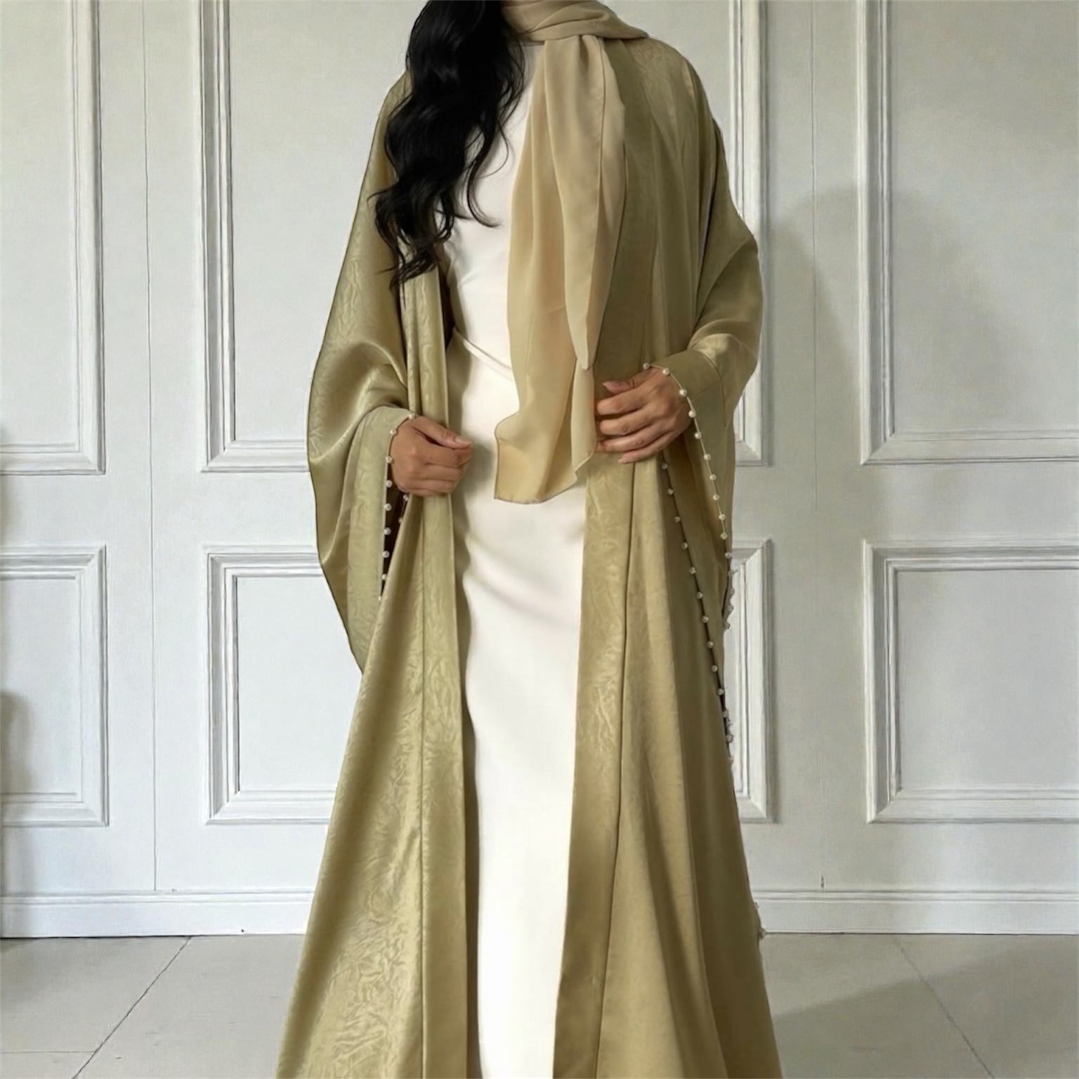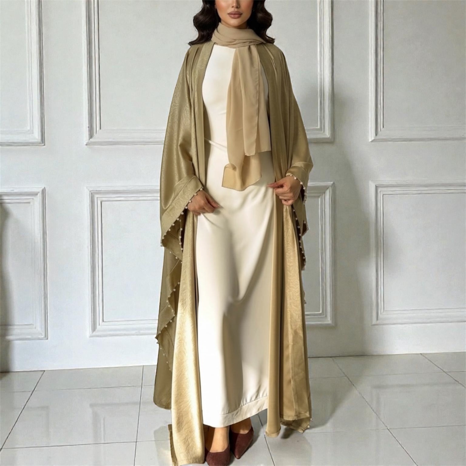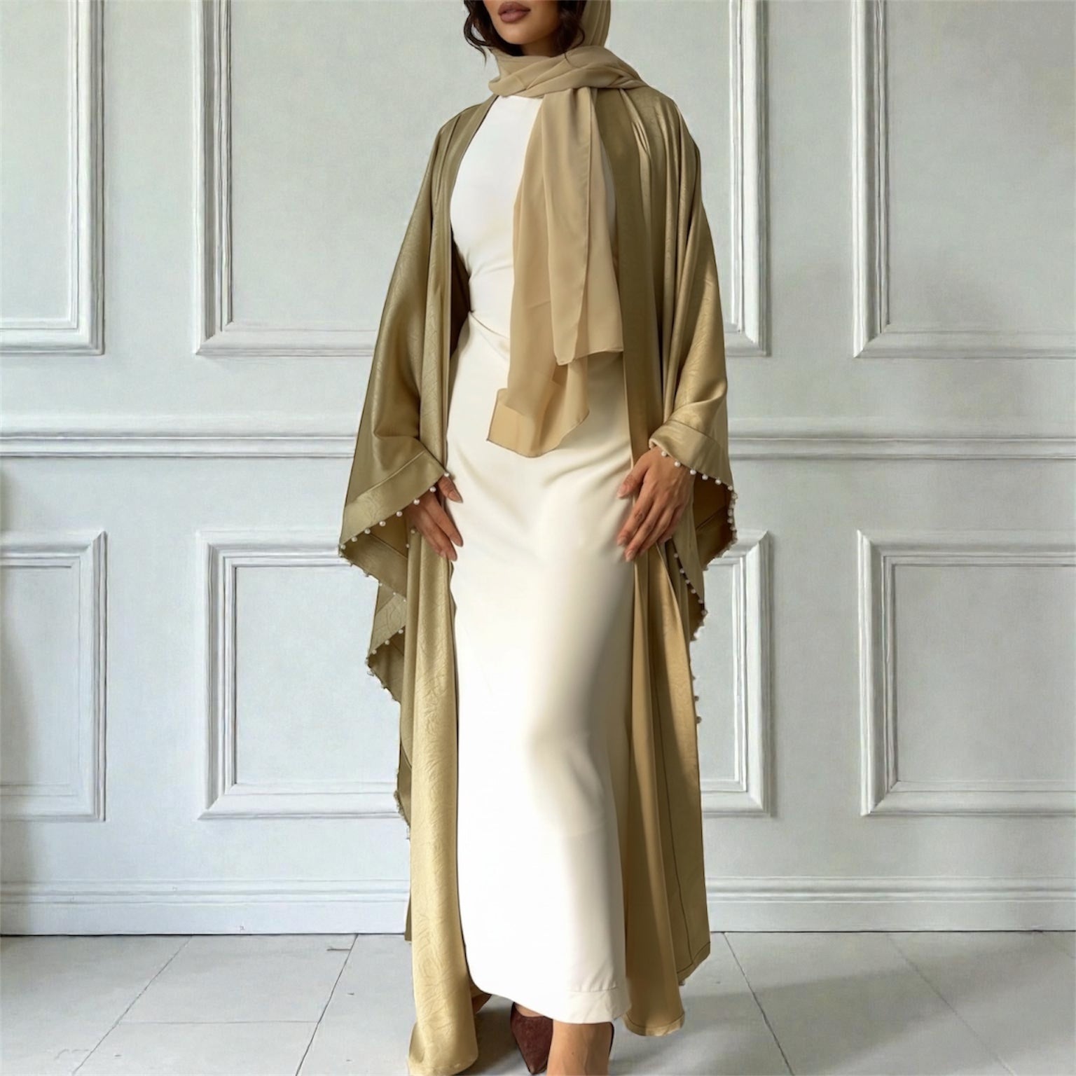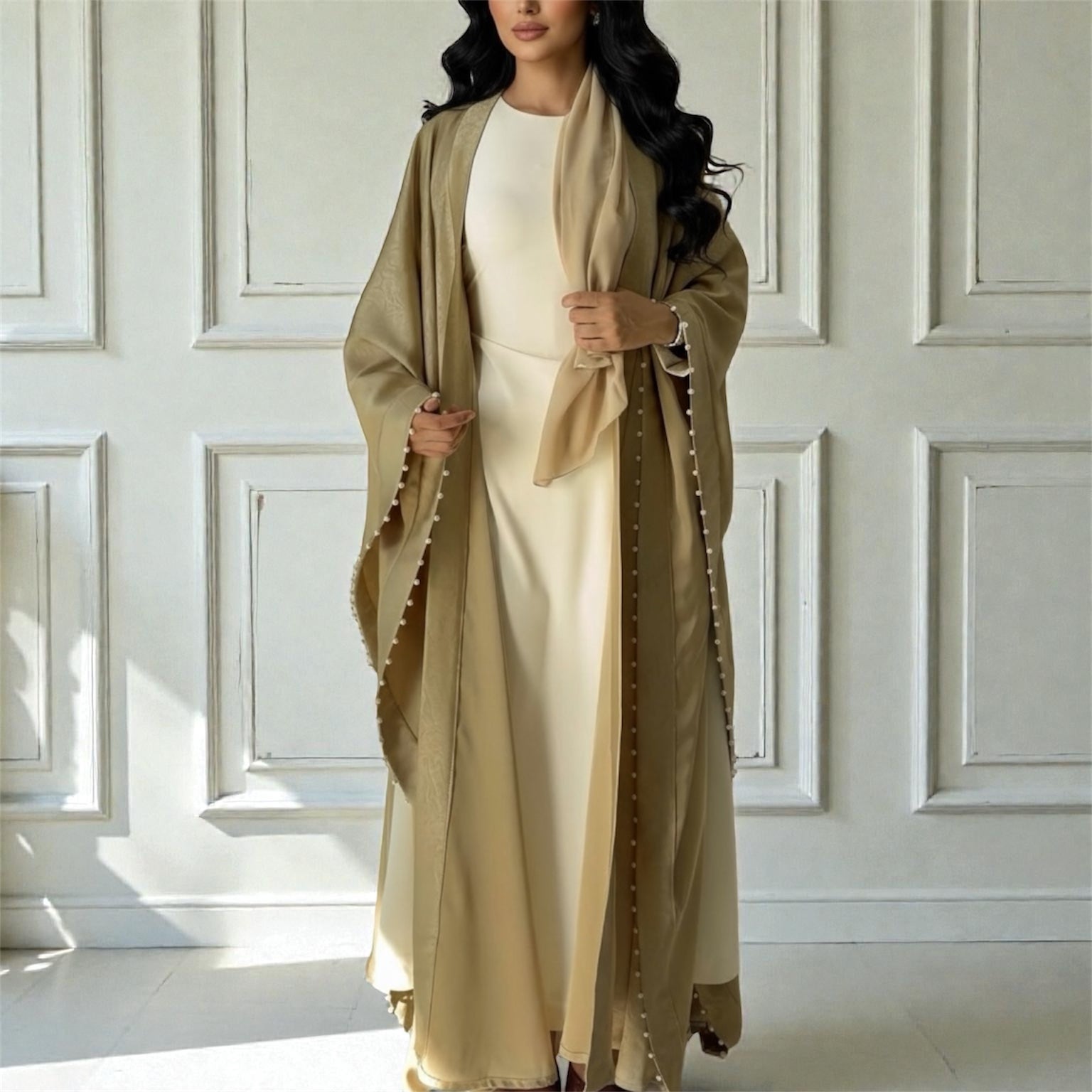 • العباية: قماش ستان ناعم منسدل بلمعة خفيفة تُعطي فخامة، ستايل بدون أكمام مزين بحبات اللؤلؤ على طول اليد.