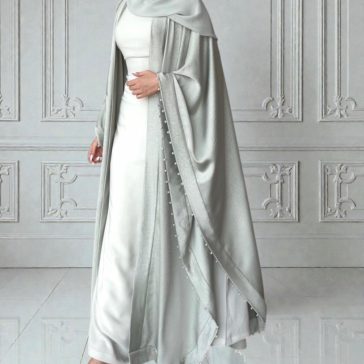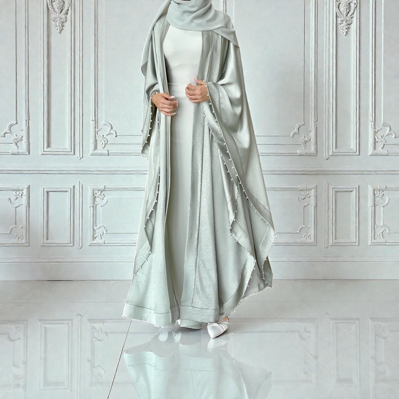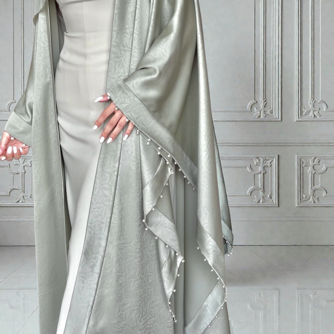 • العباية: قماش ستان ناعم منسدل بلمعة خفيفة تُعطي فخامة، ستايل بدون أكمام مزين بحبات اللؤلؤ على طول اليد.